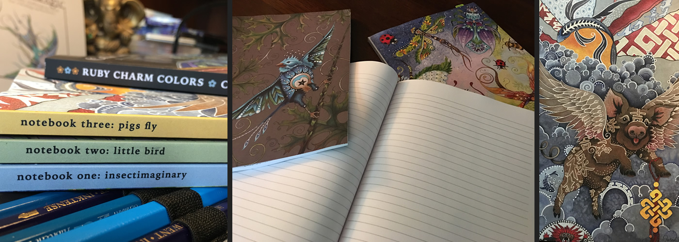 I have been trying to work on new art but find it happens in just bits and pieces these days. More often than not, I fall victim to watching the news or reading stories from my Twitter feed obsessively and that’s not healthy. So, the other night, in an attempt to turn off the Corona noise, I flipped open my 2020 Creative Companion to page 15 and started coloring my crazy Praying mantis. Then I moved on to the Ozara beetle on page 14, then the chubby Behati on page 16. It was a night (and good chunk of the next morning) of coloring bliss, and I enjoyed unplugging and trying something a little new.